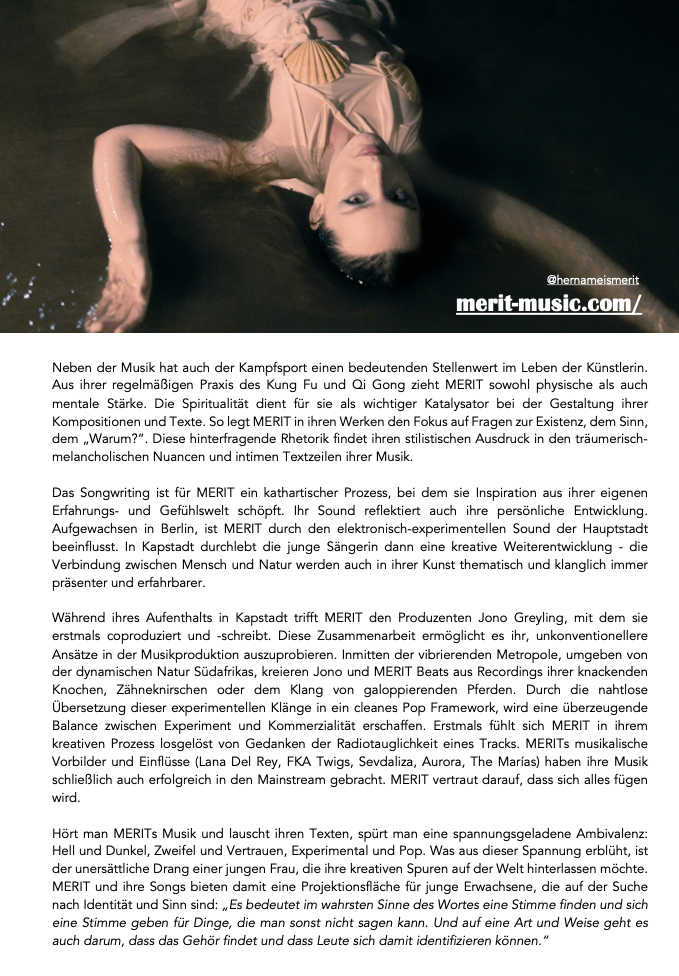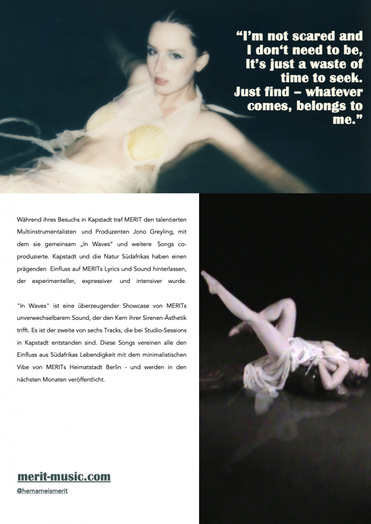 Für die Single-Veröffentlichung „In Waves“ von MERIT habe ich sowohl den Pressetext als auch ihre Künstlerbiografie verfasst. Wenn man sich fragt, wie es wohl klingen würde, wenn Lana Del Rey kein Millennial wäre, sondern zur Gen Z gehören würde – liefert MERIT hierauf die Antwort. Ihr Sound ist mystisch und sirenengleich, und es war meine Aufgabe, diesen einzigartigen Klang mit meinen Worten einzufangen.