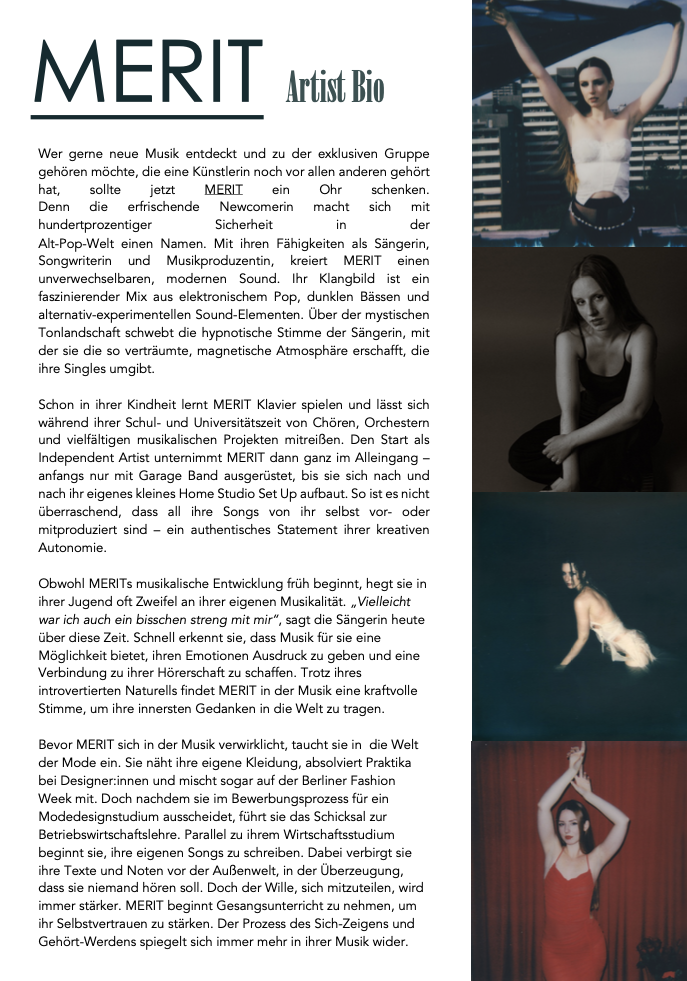 MERITs Sound und Artist Branding ist eine fesselnde Reise in eine Welt des geheimnisvollen und verführerischen Klangs, und ich hoffe, dass meine Texte dazu beitragen, ihr Talent und ihre Einzigartigkeit einem breiteren Publikum näherzubringen.