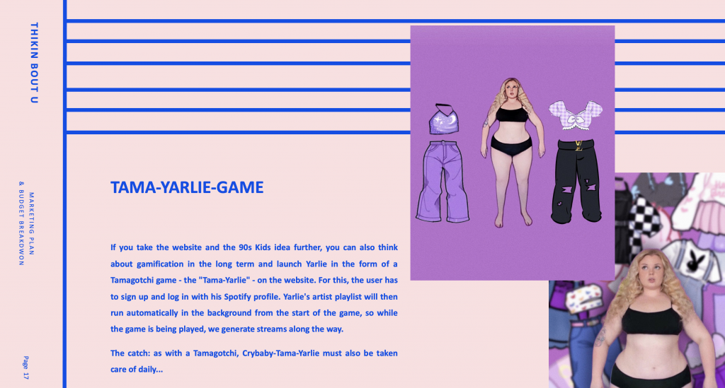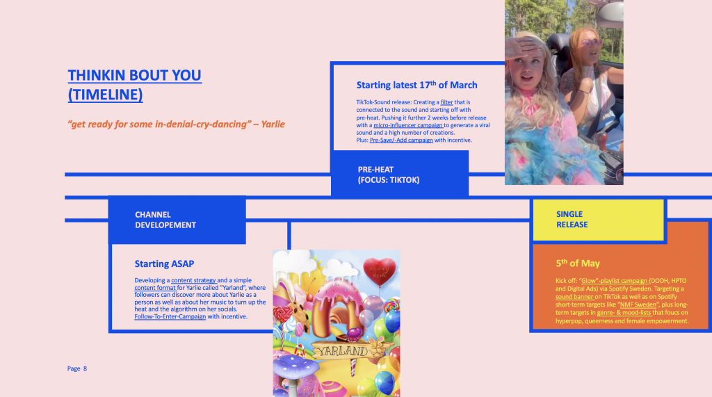 Das Pitching Deck enthält zudem eine Timeline, die die Phase vor und nach der Single-Veröffentlichung mit kreativen Marketing-Ideen unterfütterrt. Dazu gehören innovative Konzepte wie ein an Tamagotchis angelehntes Spiel, bei dem Yarlie als Tamagotchi agiert, sowie die Entwicklung eines Instagram-Filters, der perfekt zur Single und Artist Identität passt. Neben diesen kreativen Ansätzen sind auch bewährte Marketing-Maßnahmen wie Pre-Save-Kampagnen, Influencer-Marketing und Digital-Marketing auf Instagram und TikTok Teil des Plans.