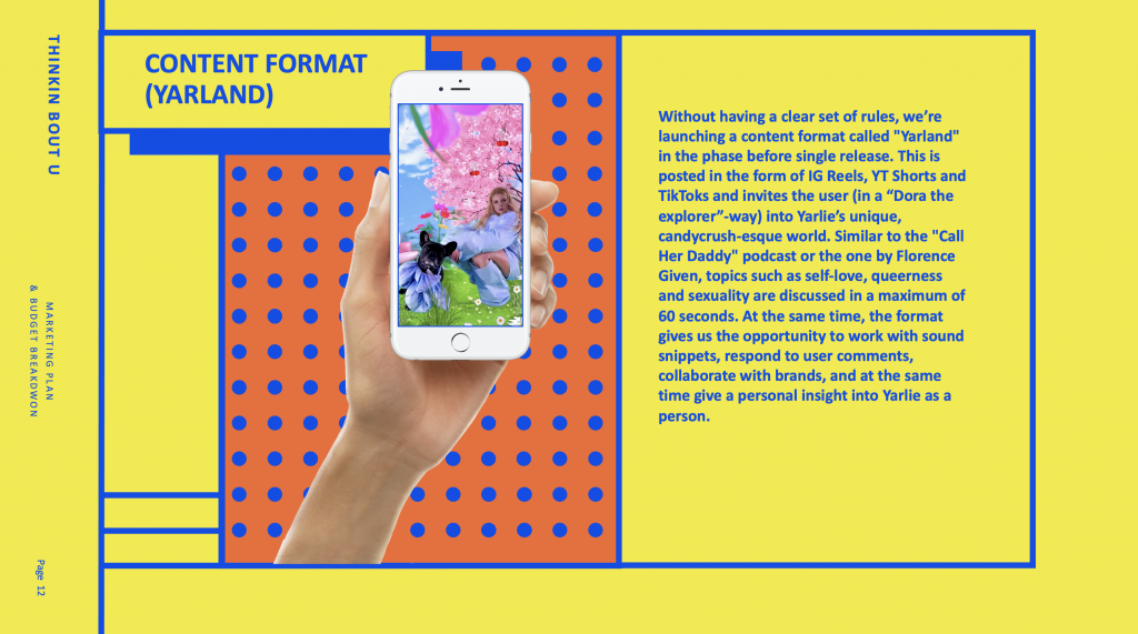 Für die Single „Thinkin Bout You“ der schwedischen Künstlerin Yarlie habe ich ein umfassendes Pitching Deck erstellt, das eine gründliche Zielgruppen- und Künstlerbrand-Analyse sowie einen detaillierten Budgetplan enthält. Yarlie hat eine einzigartige 90er-Jahre-Ästhetik und taucht vollständig in einen elektronischen Hyperpop-Sound ein, der an alte Videospiele erinnert und Vertreter:innen der Gen Z in den Bann zieht.