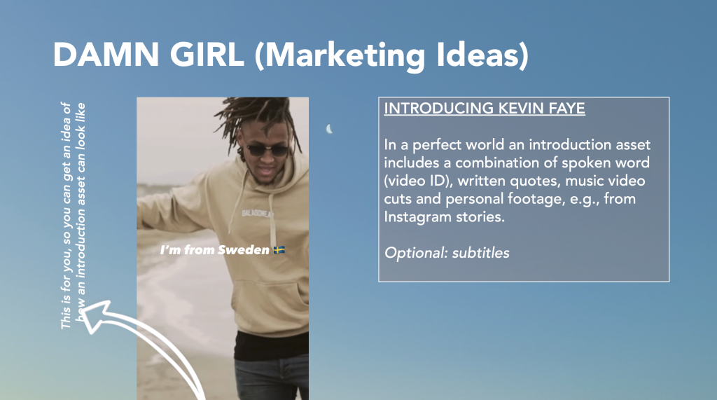 Ein zentraler Bestandteil des Konzepts ist ein durchdachtes Marketingkonzept, das auf die Durchführung einer User-Generated-Content Kampagne auf Instagram und TikTok fußt. Diese Kampagne sollte Reiselustige ansprechen und sie dazu inspirieren, sich und ihren Travel-Content mit der Musik von Kevin Faye zu posten. Das Konzept enthält auch eine digitale Marketing-Kampagne, die darauf abzielt, Kevin Faye im deutschen Markt online vorzustellen. Hierzu habe ich einen Asset-Vorschlag erstellt, um Kevin Faye optimal zu präsentieren. Darüber hinaus habe ich Meilensteine festgelegt, einschließlich Playlist-Platzierungen und Promotionsziele.