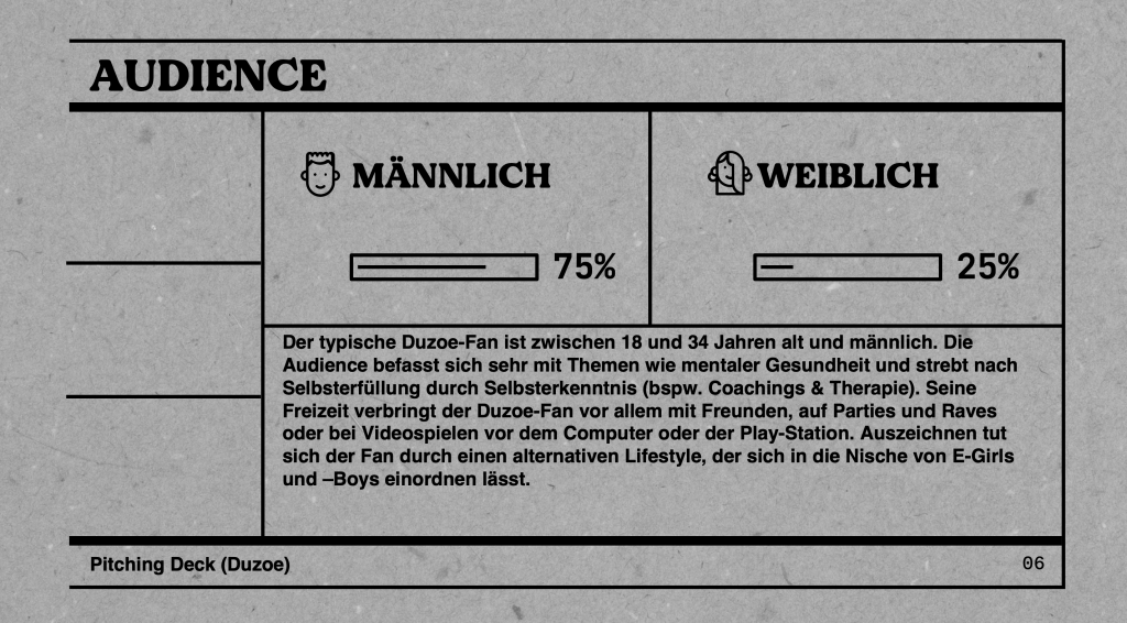 Für Duzoes kommendes Album habe ich ein überzeugendes Pitching Deck erstellt, das uns die Förderung durch die Initiative Musik gesichert hat. Das Konzept ermöglichte uns den Entscheidern ein tiefes Verständnis für Duzoes Arist Brand und musikalische Message zu vermitteln. In dem Pitching Deck habe ich deshalb den Kern von Duzoes Artist Brand herausgearbeitet und die Highlights aus seiner letzten Albumkampagne für „watchmeburn“ präsentiert.