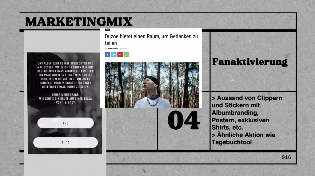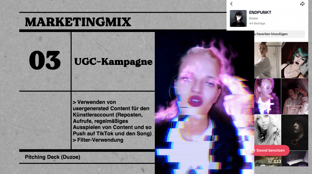 Besonders hervorzuheben ist jedoch die von uns geplante Fanaktivierungsaktion, die die Hardcore-Fans aktiv in den Veröffentlichungsprozess miteinbeziehen soll und die Bindung zum Artist stärkt. Darüber hinaus planen wir Digitale Marketingassets, die den Social-Media-Nutzern einen Mehrwert bieten und sie dazu anregen sollen, mit Freude die Musik von Duzoe zu streamen.
