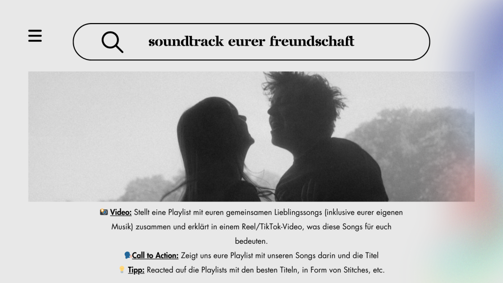 Von freundschaftlichen Meilensteinen über Insider-Challenges bis hin zu musikalischen Core Memories – das Konzept ist darauf ausgelegt, ihre Musik mit persönlichen Einblicken zu verbinden und gleichzeitig ihre Fans aktiv einzubinden. Mit gezielten Trends und Call-to-Actions können Lena & Linus nicht nur neue Hörer:innen gewinnen, sondern auch ihre Community auf TikTok und Instagram wachsen lassen.